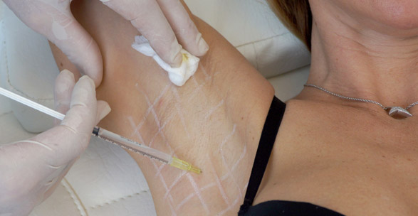 One vial of botulinum toxin (Vistabel, or Bocouture, Azalure) per axilla is necessary to obtain an excellent result. This product is injected very superficially into 15 to 20 points per axilla. This injection is painless and totally safe.